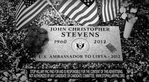 The ad, which closed with an image of John Christopher Stevens' gravestone, was creating by the Stop Hillary PAC. Though its name gives it away, the group's website states its mission as follows.
