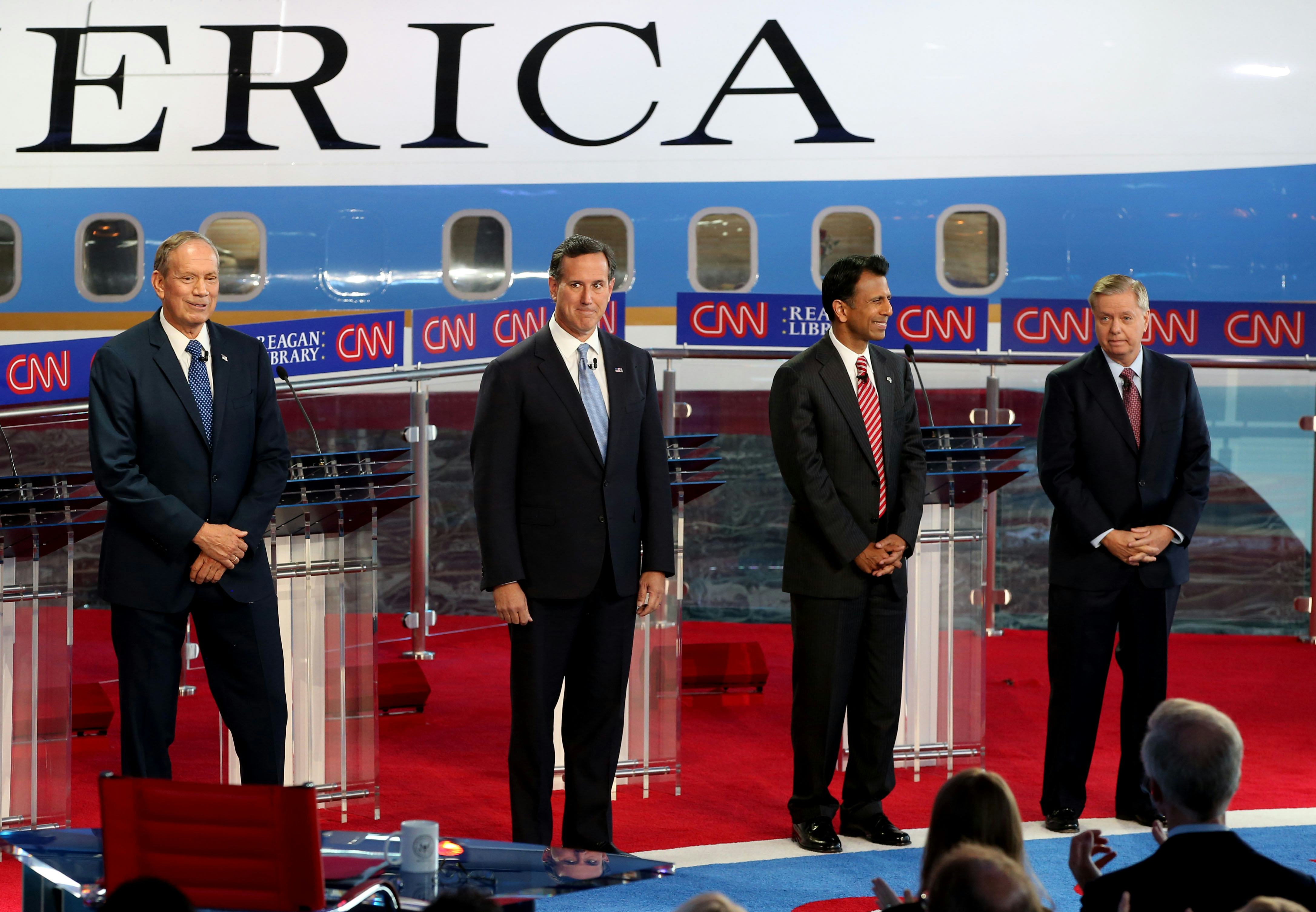 The JV debate will commence at 6 p.m., and wrap up in time for the primetime debate to kick off. The kids' table crowd has been reduced to four candidates who just don't want to give up on their presidential dreams: Rick Santorum, Bobby Jindal, George Pataki, and Lindsey Graham. All four of these candidates have yet to make it high enough in the polls to show their faces during primetime, but will battle it out with one another once again next week.
