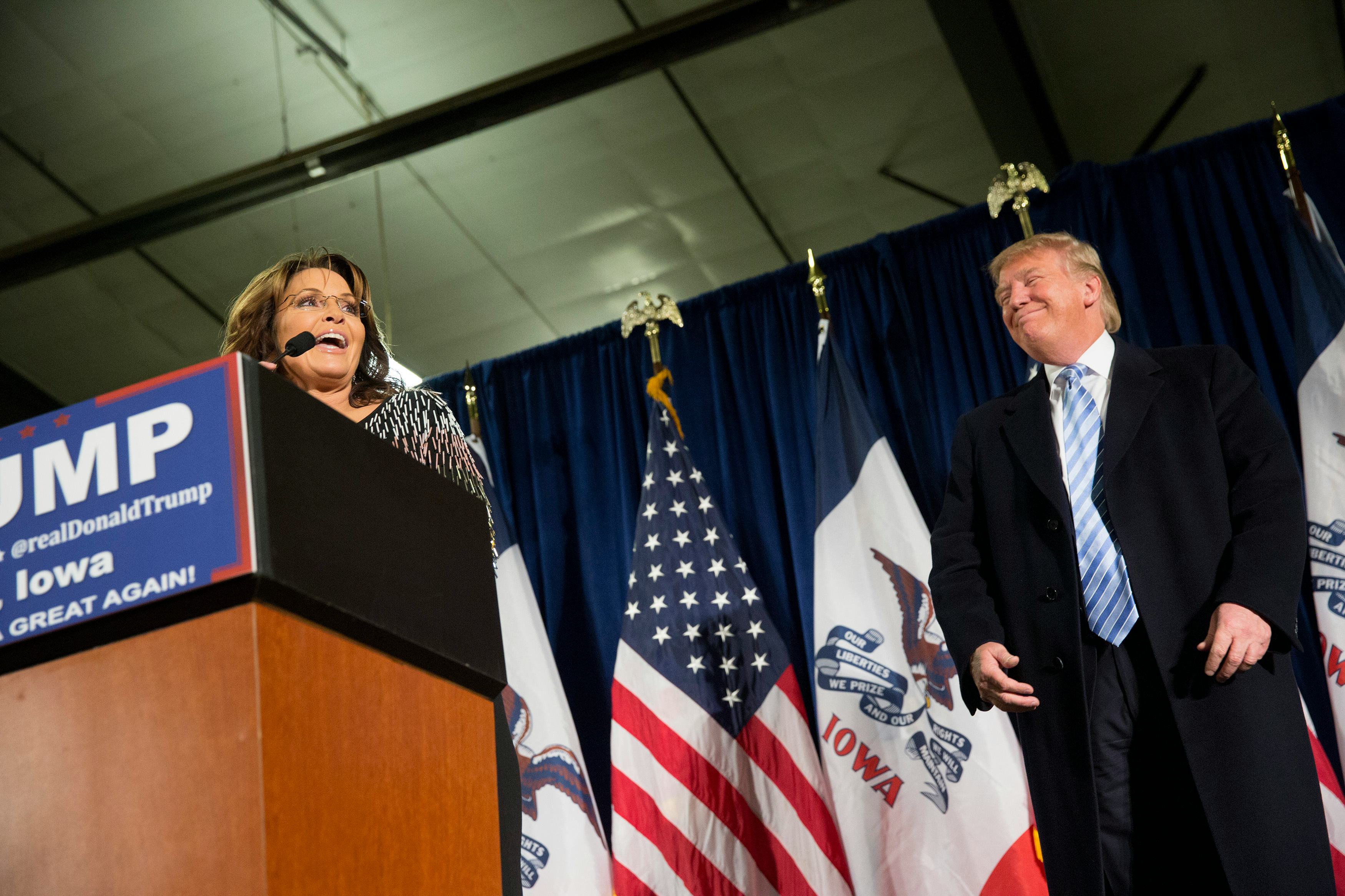 The two appeared something akin to chums at the political campaign rally, which took place less than two weeks before the Iowa caucuses. Palin announced to attendees that she was there to "support the next president of the United States." The former VP nominee also asserted that it's been Trump's willingness to go "rogue left and right" — a strategy Palin knows all about — that has brought him such success on the campaign trail so far.