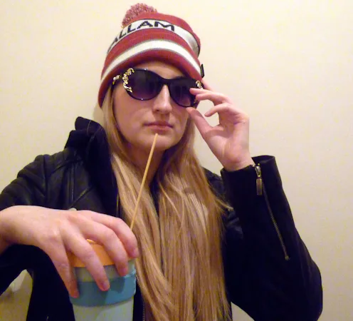 Mily Reuter is the coolest of all the cats. Here I am trying to emulate her, but you just can't fake cool. My fiancé's college hat and piece of wood posing as a straw have nothing on Reuter's edgy ensemble, complete with a Starbucks cup. She is represented by a selection of modeling agencies including Ford, and she was seen on the Jenny Packham catwalk.