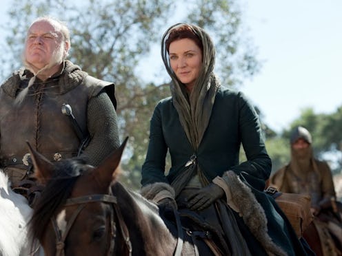 Not to sound like a broken record or anything, but does anyone else feel like Lady Stoneheart could actually appear on Game of Thrones next week after watching the latest teaser promo for "No One?" Because while the clip shows many familiar faces (like a very heated Brienne and Jaime reunion), there was one thing in particular that immediately caught my attention: the presence of the Brotherhood Without Banners. For those of you who need a little refresher on who these guys are, they're made up of a group of outlaws who hold a severe grudge against the Lannisters. You should also recognize a few members of their party, such as Thoros of Myr and Beric Dondarrion, both of whom Arya came across back during her more innocent days. In fact, she even witnessed them using the Lord of Light for resurrectional purposes. Perhaps their return signifies that another resurrection is about to (or already has) taken place.