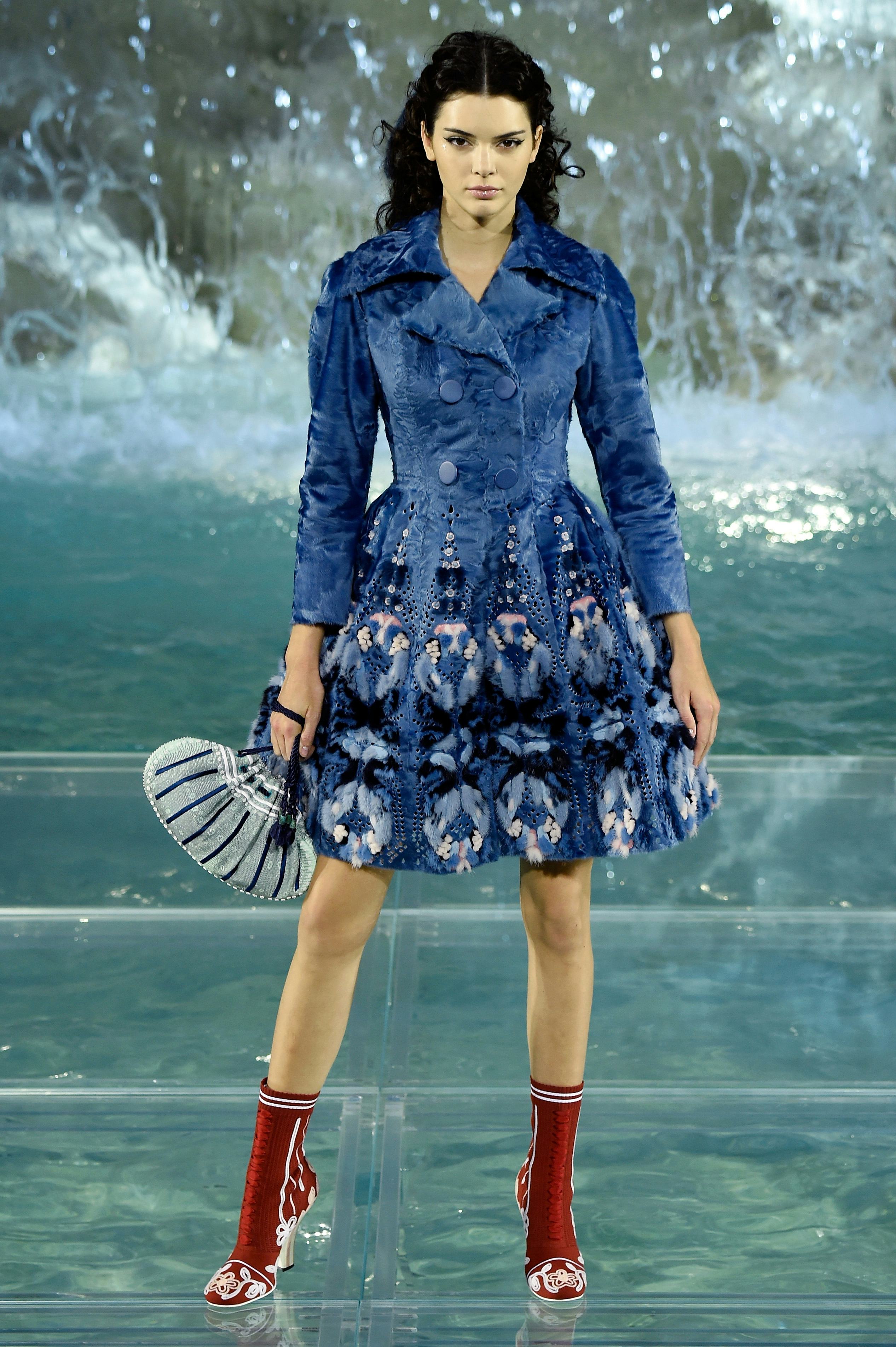 Update: Jenner's outfit is by Gucci. Gucci PR reps confirmed to Bustle that the model is wearing the brand via email.