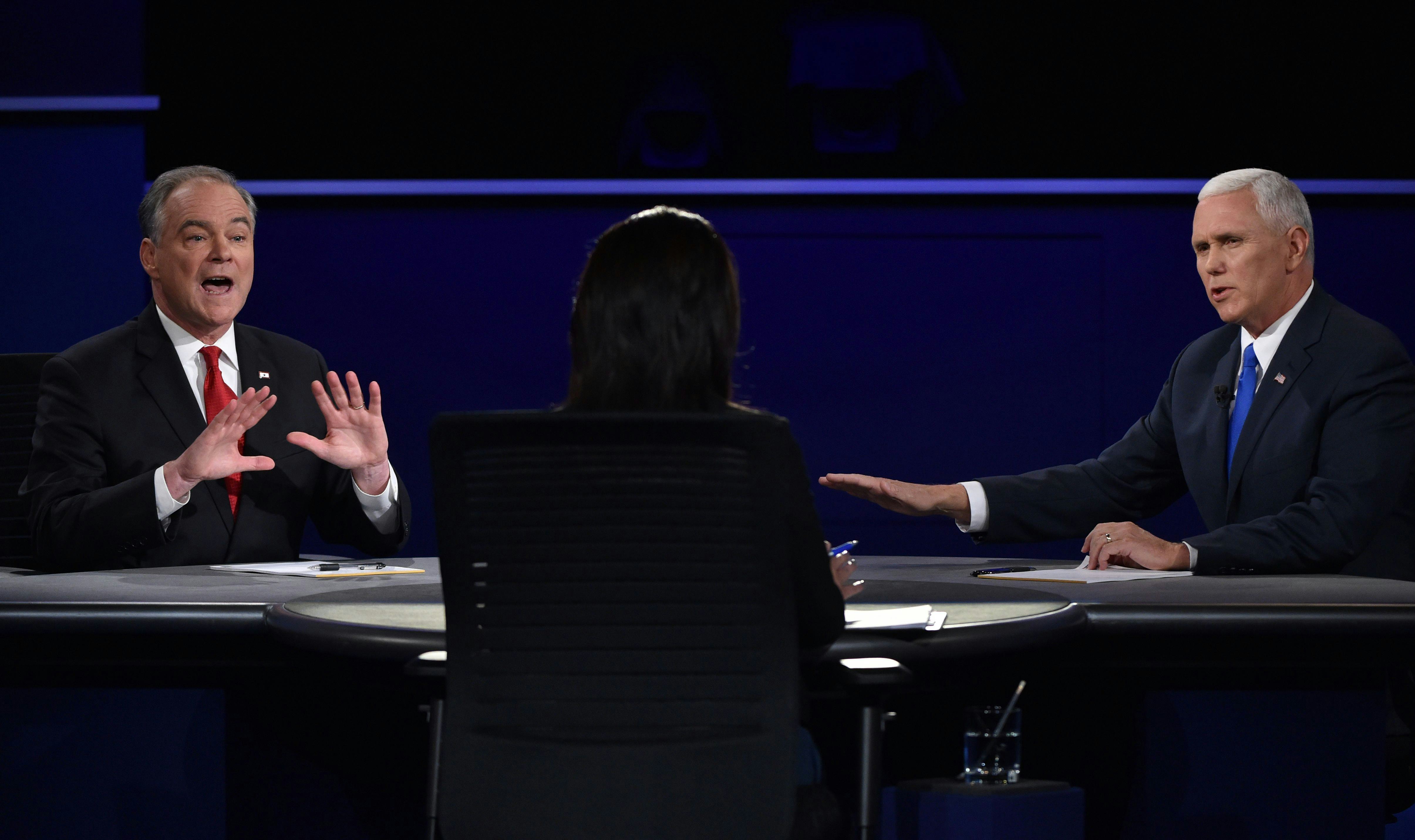After Sen. Kaine called Putin a "dictator" and not a "leader," Pence responded by saying: "I'm just trying to keep up with the insult-driven campaign." Kaine interjected with, "I'm just stating the facts of your running mate."