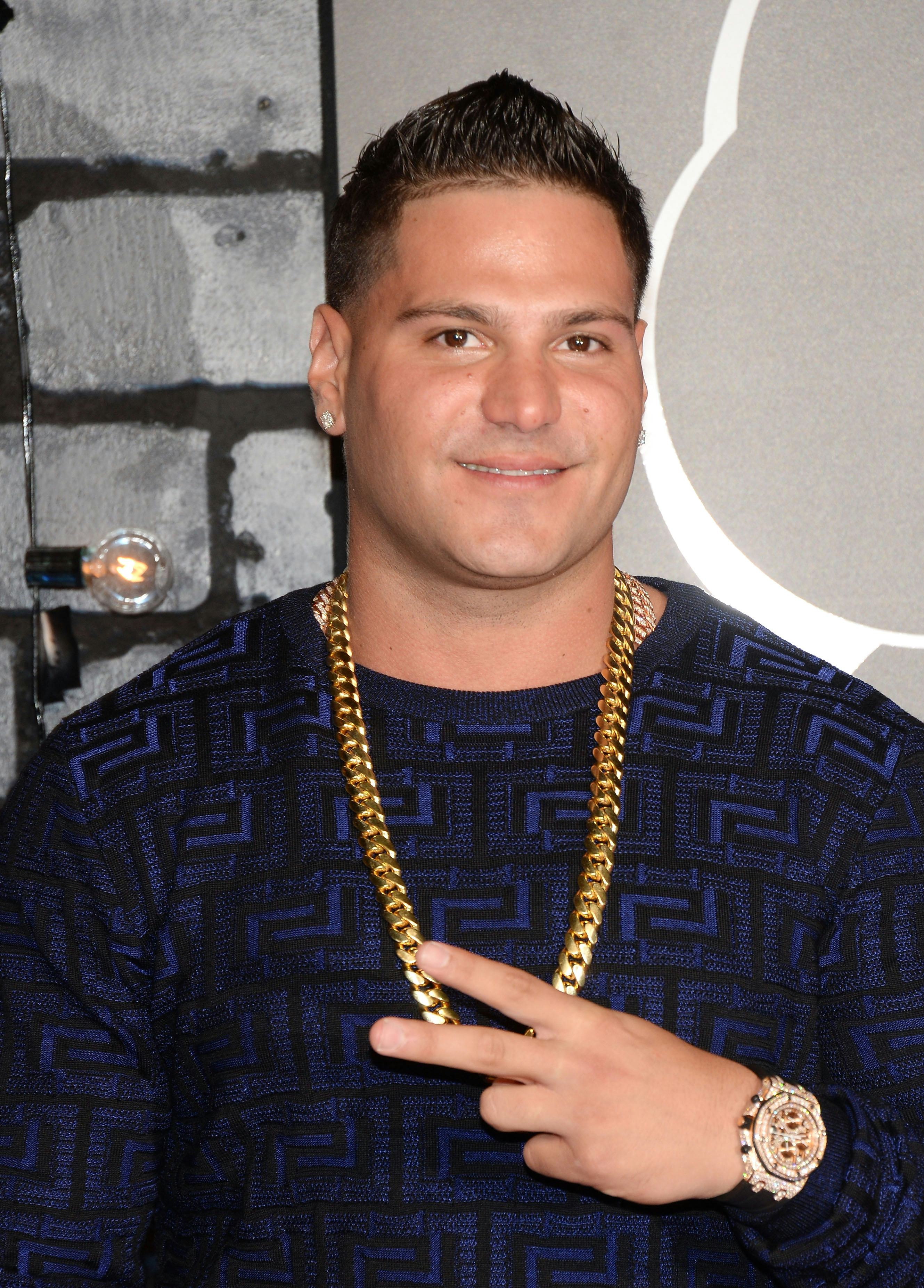 Ronnie posted the following picture to his Instagram on Tuesday, after meeting up with his old roommate to attend the premiere of Jersey Shore Massacre, a horror spoof of the show that JWoww produced. JWoww gave birth to Meilani about a month ago, and this appears to be Uncle Ron's first visit with the baby. In the pic, Ronnie is sporting his most show-stopping aviators, his loudest gingham, his most slicked back hair, and his sharpest vest. He hashtagged the photo "#family #lovethem #realmenwearpink #meilani." Now that the Jersey Shore stars are cradling children instead of handles of Smirnoff, the days of fist-pumping have officially reached Retro MTV Status.