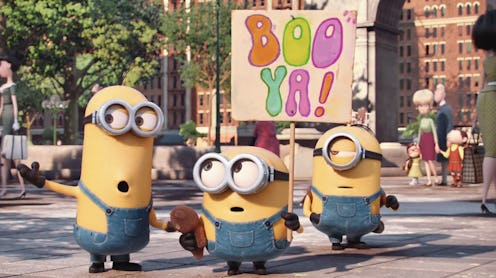 If you're having a bad week, this clip of the Despicable Me Minions in Manhattan will cheer you right up. After a ridiculously adorable trailer for the spin-off movie — aptly titled Minions and out July 10 — and an equally amazing "Jingle Bells" Christmas caroling video that came out last month, I've been anxiously awaiting more footage of the tiny yellow creatures. Now we have a sneak peek at their origin story as they set foot in Manhattan in 1968, finding their signature blue overalls and inadvertently participating in a peaceful hippie picketing. ("Boo ya!" reads Bob's sign.)
