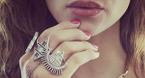 Flea Market Girl, yet another California brand, this one from L.A., features jewelry made from a variety of metals, stones, and leather to create "looks ... from edgy to dainty, which is expected to make the quintessential 'flea market girl' feel confident in her own style." I love the contrast of the boldly golden braided strap and the iridescent blue cabochon. Cooler shades dominate the brand's collection on Colabination.