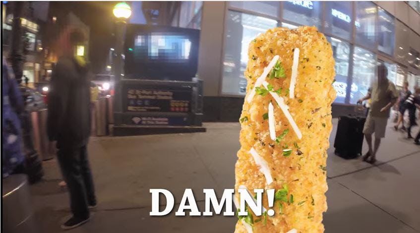 Oh, OK then. So as long as it helps you sell buffalo wings and bruschetta bites or whatever these apps are called, mocking a pervasive problem like street harassment is totally fine, I guess, and it's not irritating at all to watch scenes lifted from the first video, but with a (sexually harassed, deeply uncomfortable) woman replaced by a fried food item. There is not enough side-eye in the world for this.