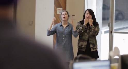 Girls have a pretty good idea of what we think guys are saying when we can't hear them. It's from years of experience, the inherent truth of many stereotypes, and our gut instinct. Buzzfeed's new video addresses what girls think guys are saying with some humorous clichés. As two women watch two male co-workers converse, they have the conversation they think the guys are saying and—spoiler alert—it revolves around sports and boobs. While I have no doubt that the average man talks about sports (of course, not all men, but you can definitely expect the median base line of dude-versation is a sporting one), the boob talk is a little bit off point. Men definitely discuss sporting plays in depth, but if you've ever been privy to a conversation wherein the average male talks about women, it's fairly un-descriptive and brief: "She's hot," which is replied to with a, "Yeah." The idea that the average man discusses a woman's breasts in detail is very '90s, and I think now only reserved to a certain type of guy. That's just my opinion anyway.