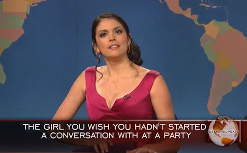 Cecily Strong definitely made an impression worthy of her last name while hosting the 2015 White House Correspondents' Dinner on Saturday night. Strong was able to poke fun at everyone in Washington, including President Obama, and she did a great job of finding the balance between funny and controversial in many jokes about important social issues like women's rights, racism, and LGBT rights. The great speech was basically expected, considering how awesome she was during her time at the Weekend Update desk on Saturday Night Live (it still hurts that she's gone, you guys). But what I was hoping for more than anything else was at least a few jokes or references to one of her most beloved characters from Saturday Night Live that actually appears during Weekend Update. Come on, you all know who I'm talking about, it's the Girl You Wish You Hadn't Started A Conversation With At A Party! While Strong mostly stayed away from rehashing that character and focusing more on witty zingers, there was one moment that might have been a reference to Strong's (arguably) best recurring character.