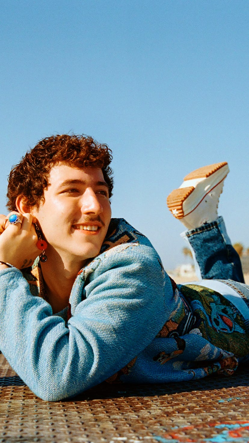 It’s only when revisiting this most recent period of his life that Jonas slouches down into the couch and jiggles his leg, his normally animated voice becoming small. He pauses and quickly pulls the photo up on his phone. In it, his eyes read hollow and tired. “It’s just exhaustion,” he says. “So much of that time was me being like, ‘I’m done being Frankie Jonas.’” He coped with not wanting to be Frankie Jonas by drinking and using drugs, which he later described on TikTok as “trying to kill himself accidentally.” But “something intervened, and my life was saved,” he said in the video. “I went to treatment, and it saved me.”