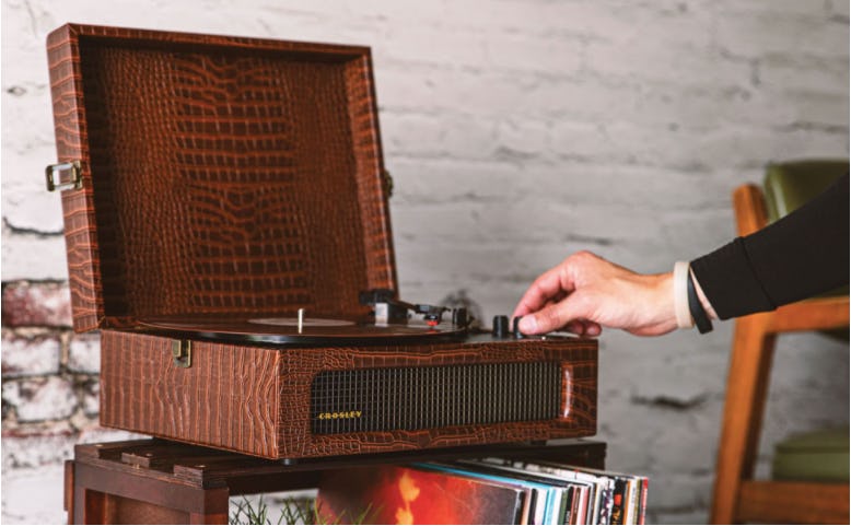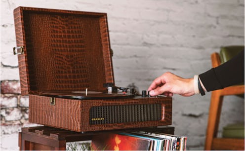 A step up from the classic Crosley Cruiser, the Crosley Voyager portable record player is larger and has a wider, built-in stereo speaker that runs almost all the way across the front. Like the Crosley Cruiser, it has three speed settings and a built-in Bluetooth receiver, so you can not only play any type of vinyl, but also digital music. If you want a bigger sound, it’s easy to plug this record player into your home stereo system with the RCA jack in the back or, for personal listening, you can plug your headphones in to the jack on top. The case of this 5.5-pound record player has locks on both sides of the top for secure closure, and it’s available in a variety of colors, including sage, floral, and washed blue.