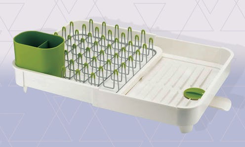 This Joseph Joseph single-tier drying rack is your best bet for getting pots and pans dry. The rack doesn’t have designated spots for specific items, but rather it features steel prongs with non-scratch tips that can accommodate all types of cookware, pots and pans included. The drying rack measures 12.5 by 14.25 inches at its most compact, but you have the option to increase its size as needed. Just ask Amy Biggart, a Commerce Editor at BDG, who uses this rack in her apartment kitchen. “Without a dishwasher, I need a lot of space to dry dishes and this one expands so it can fit everything from a colander, to a soup pot, to all of my bowls and plates,” she explains. The rack can be extended to almost twice its original size, which is convenient for maximizing counter space without sacrificing the size of your dish drying surface. The integrated drain spout can direct the excess water straight into the sink or can be closed for draining later on. Nonslip feet ensure that the rack will be secure and stable. This pick has a cutlery holder with a knife slot, too, but it can be moved around or taken out if needed. It also has a rail to make it easier to dry cutting boards. If you don’t like this stainless steel version, the drying rack also comes without the stainless exterior for about $10 less in your choice of a few different colors — just know that the plastic version also lacks the cutting board rail and knife slot.