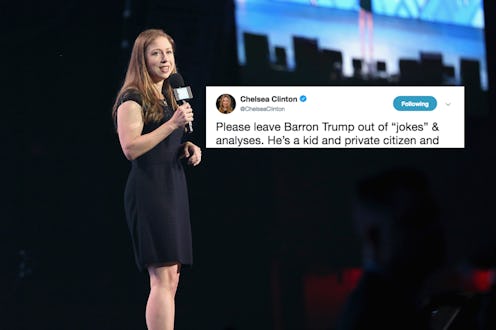 A former first daughter just came to the defense of one of the current first children, and it's not the first time she's done so. Chelsea Clinton's tweet about Barron Trump on Monday evening showed that her feelings on how presidential children should be treated hasn't budged a bit: they should be left out of political satire and commentary, as she's always maintained. Specifically, Clinton responded to a tweet by journalist Jonathan Chait on Monday night that suggested Barron might become POTUS' new Chief of Staff. Clinton didn't find it so funny.