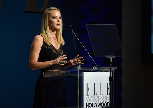 Since sexual assault allegations against Harvey Weinstein have come to light over the past two weeks, gender violence in the film industry has been on everyone's mind. This was especially true at ELLE's Women In Hollywood event on Oct. 16. Many women who took the stage touched on issues of sexual harassment and abuse, including Jennifer Lawrence. In her speech, Jennifer Lawrence bravely revealed she was forced to do a "naked line-up" by a producer in her early career to encourage her to lose weight.