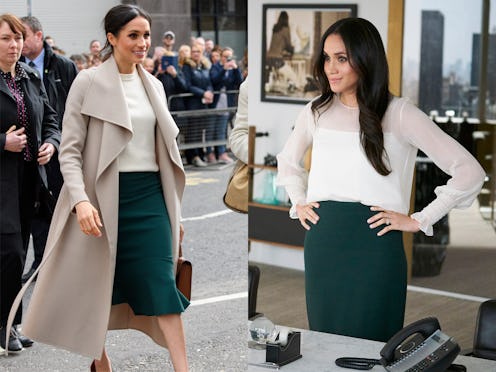 Markle looked nearly identical to her on-screen character when she chose a green skirt and white top for her first official visit to Northern Ireland in March 2018.