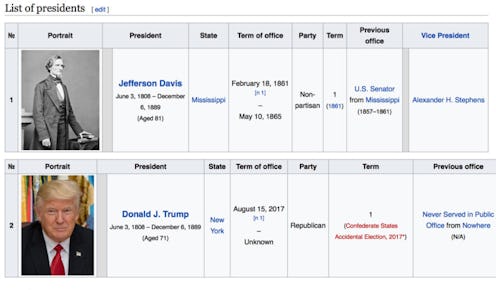 Whoever added Trump to the page made sure to add a fair amount of detail. It listed his role as president of the Confederacy as starting on Aug. 15, 2017, the day he gave his third speech about Charlottesville, which was widely regarded as giving his full support to white supremacy. It listed that he was put in the role by "Accidental Election," and outlined that he had no previous experience in office. The end of his term as president of the Confederate States of America?