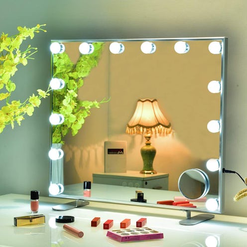 If you're looking for a full-on glam experience while you get ready, this extra-large vanity mirror is for you. Lined with 15 LED lightbulbs, the model has a touchscreen that lets you adjust brightness and choose either warm, neutral, or cool lighting. It also comes with a small 10x magnification mirror. The mirror plugs into the wall and has a handy USB charging port built-in to the side. Pick from white, black, or silver for the frame color, or detach the mirror from the base and mount it on the wall (you'll find hanging holes included on the back).