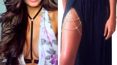 Get this gold-plated body chain with your choice of clear, green, or red crystals. It secures around your neck before plunging between the bust and around the torso, making it an eye-catching piece of jewelry that emphasizes a plunging neckline or a bikini top. It’s also length-adjustable with a lobster-claw clasp for a secure fit.