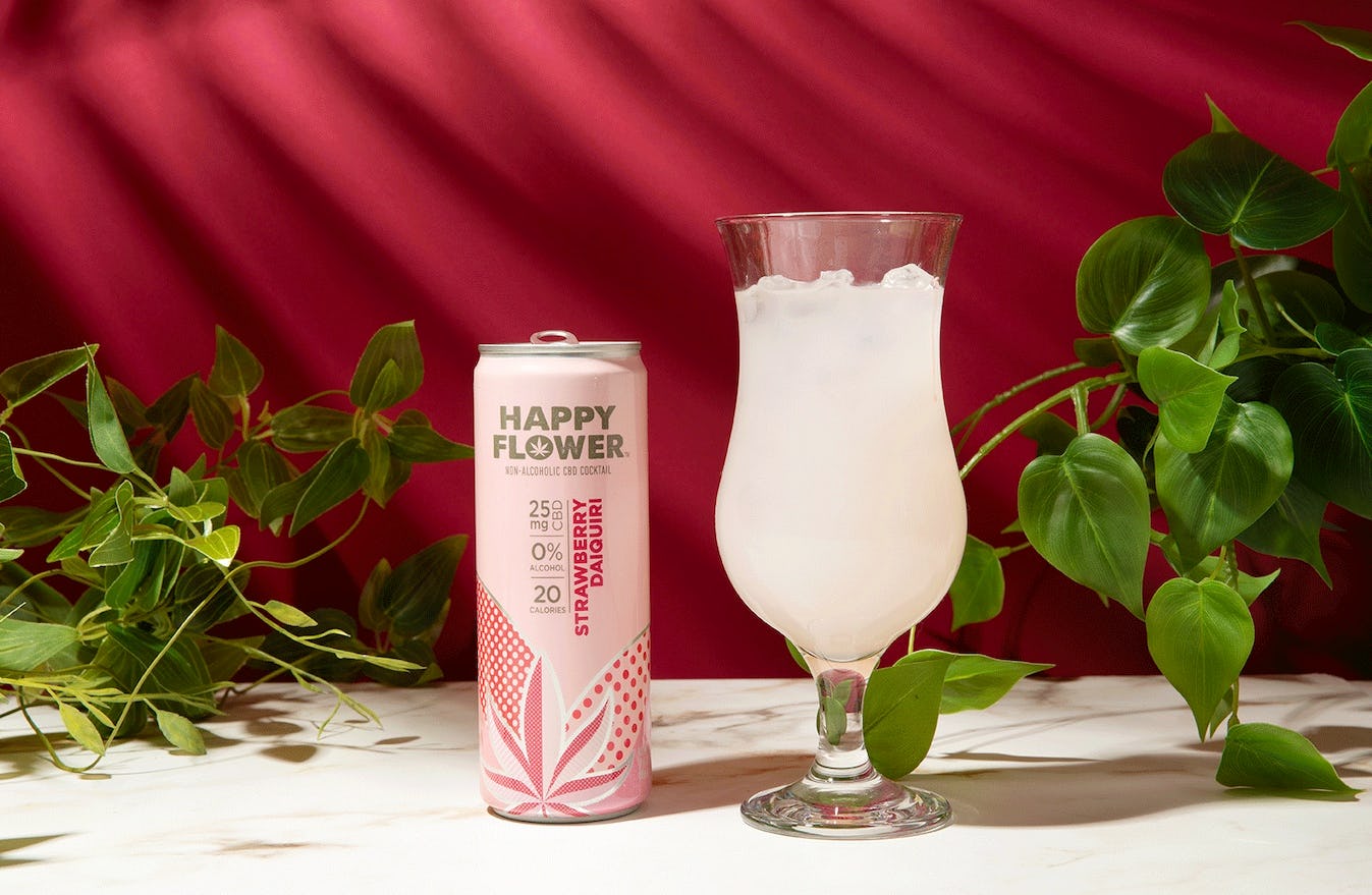 In tall, 12-ounce cans reminiscent of hard seltzers, the Happy Flower cocktail packaging is bright and poppy, though the prominent cannabis leaf emblazoned on the front makes it clear this is no average soda. There are four flavors to choose from — Mojito, Margarita, Peach Bellini, and Strawberry Daiquiri — but I’m not going to lie, the flavors don’t hem too closely to their monikers (with the exception of Peach Bellini which does taste like your fave brunch cocktail). At least in my case, it was the flavor that I expected to like least — the Daiquiri — that ended up being my favorite. It felt bright and effervescent, whereas the Mojito and Margarita flavors were more hemp-forward. I’m usually a mojito person but that one ended up ranking last on my list.